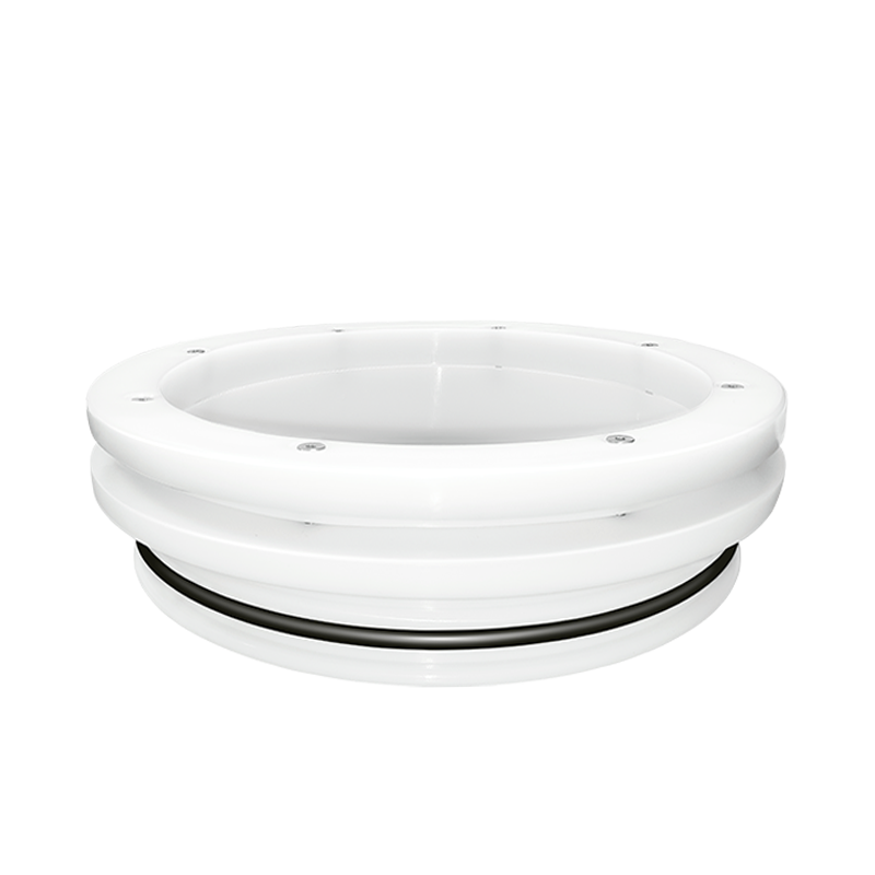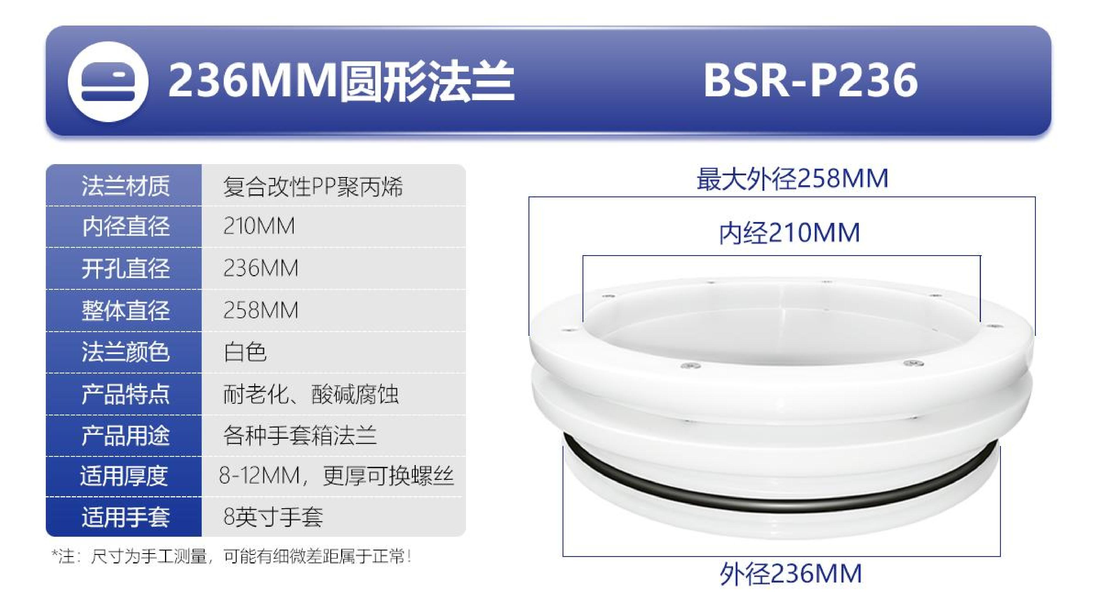 白色236MM法蘭適配于組合乳膠手套,它的材質是PP材質,適用玻璃厚度是8-12MM,適用玻璃開口是236MM,內徑是210MM,外徑是236MM。