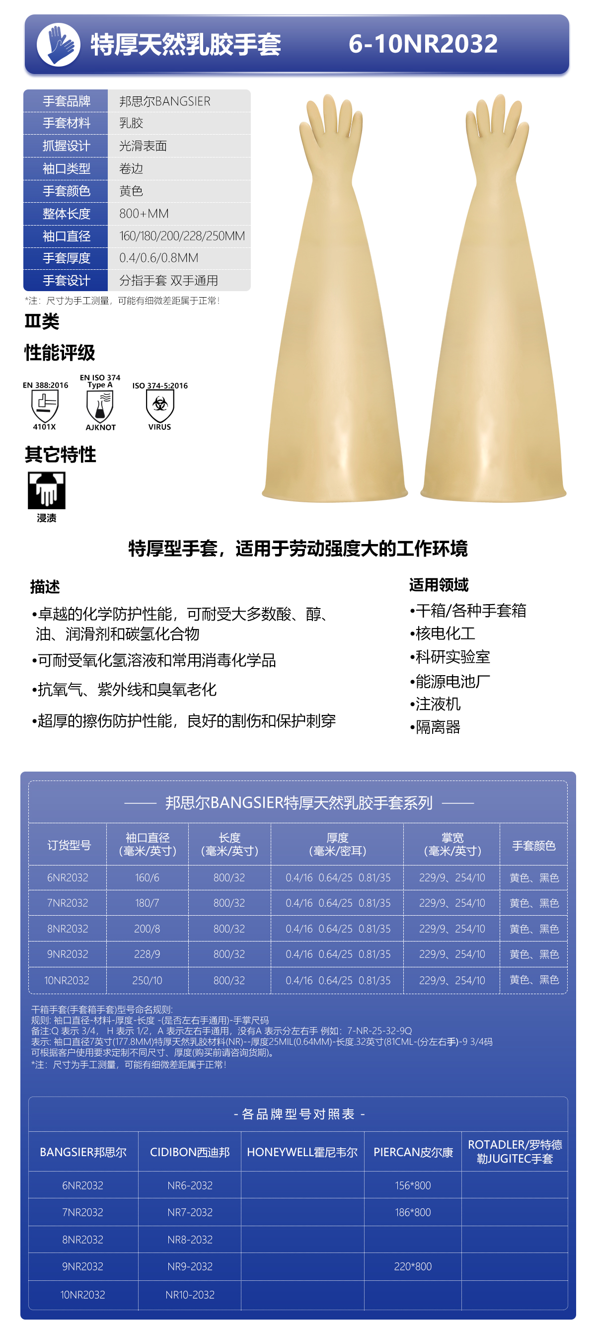可耐受大多數酸、醇、油、潤滑劑和碳氫化合物等化學防護,抗氧氣、紫外線和臭氧老化,特厚的擦傷防護性能,良好的割傷和保護刺穿。
